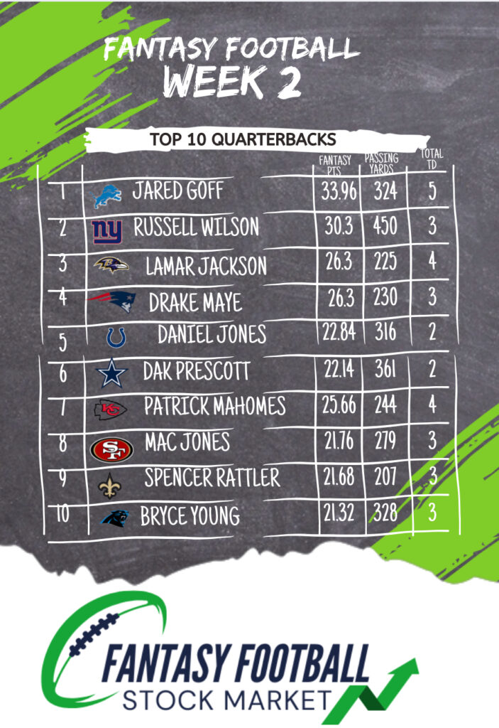 The biggest shock was Russell Wilson finishing as the #2 QB on the week a huge bounce back from week 1 start at the 24th ranked QB. Wilson put up crazy numbers with 450 yards and 3 touchdowns to post 30.3 fantasy points. However, Wilson was not the only surprise, we had Drake Maye, Mac Jones, Spencer Rattler and Bryce Young to round out the top ten for week 2. I think it is safe to say that no one expected to see those names in the top ten on the week.